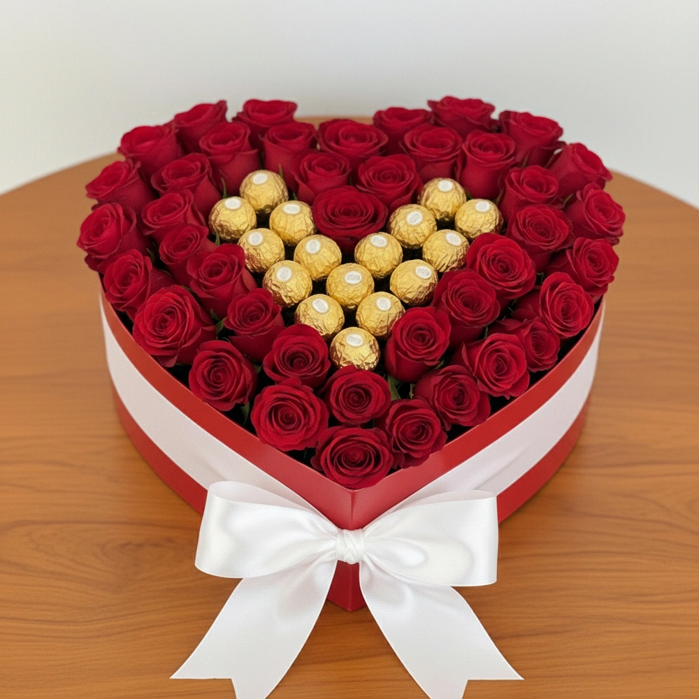 A show-stopping heart-shaped bouquet of 50 roses with 16 Ferrero Rocher chocolates