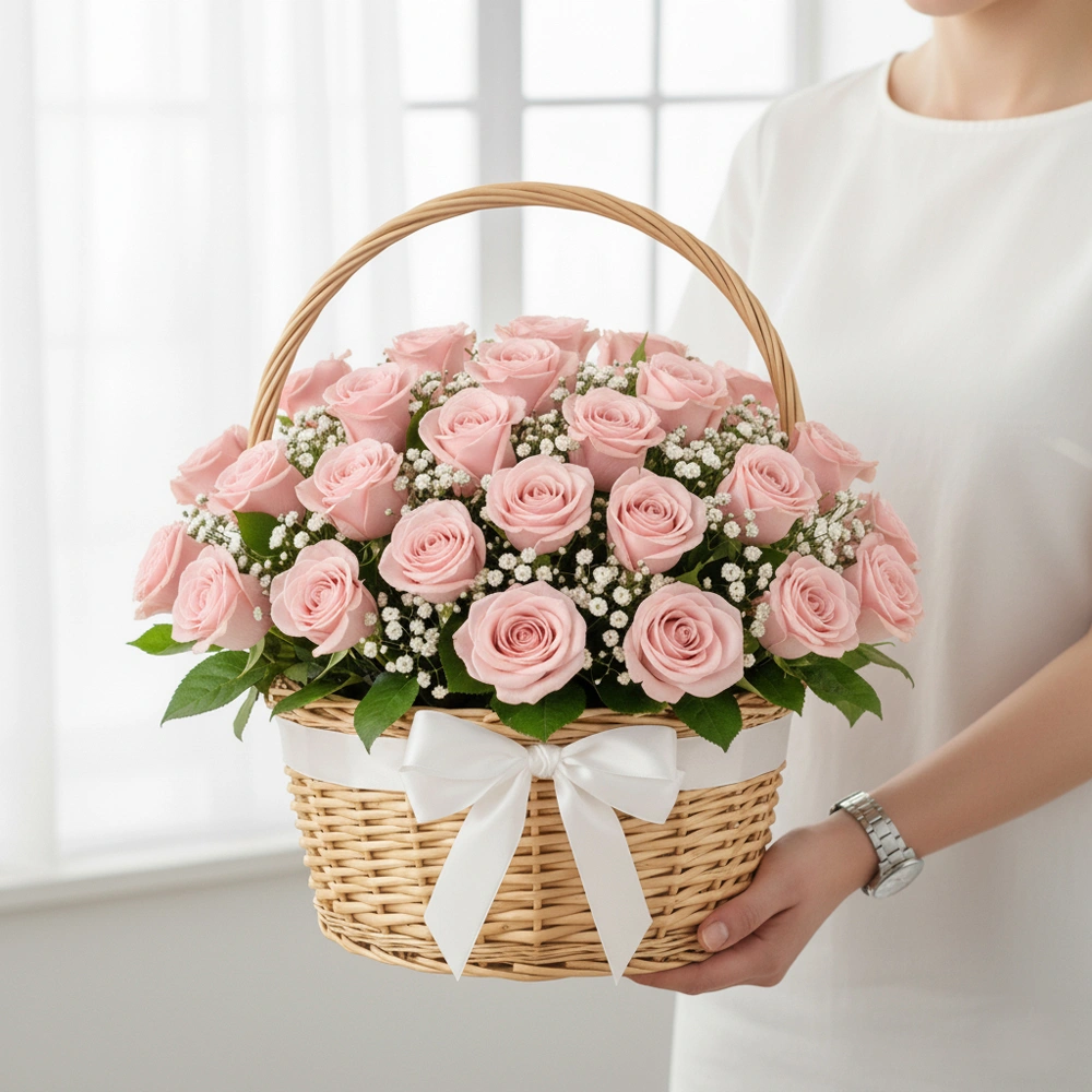 For all user 200 Rs Off on Order above ₹2500 [Code : SAVE0] 50 pink roses arrangement in basket with gypsophila