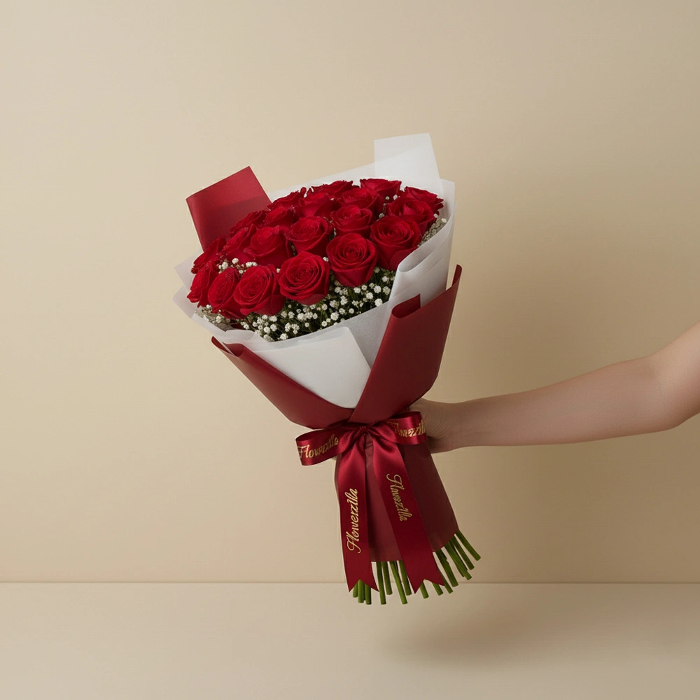 For all user 200 Rs Off on Order above ₹2500 [Code : SAVE0] 15 red roses arrangement in paper packing with gypsophila