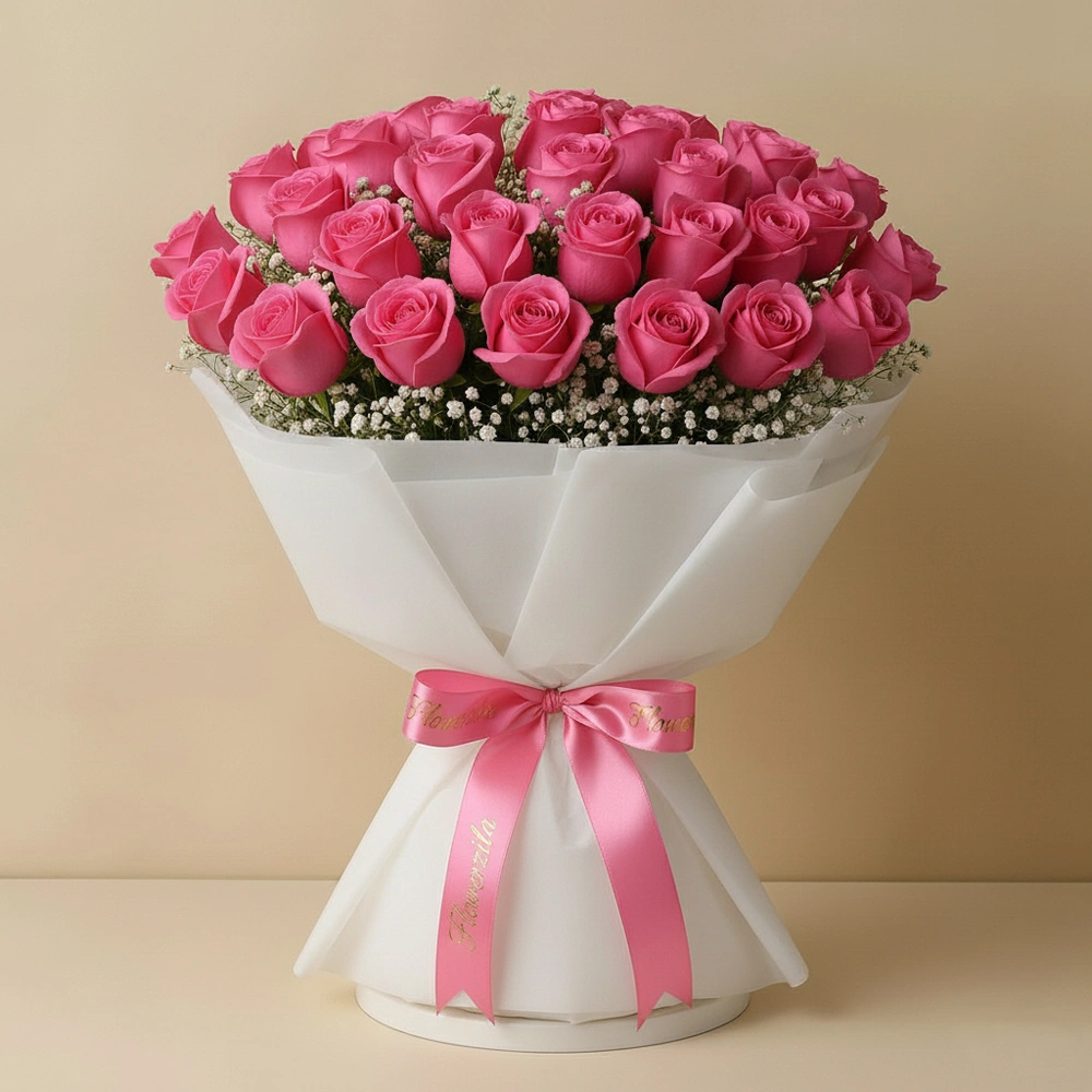 40 dark pink roses in double white tissue wrap tied with fuchsia ribbon and gypsophila