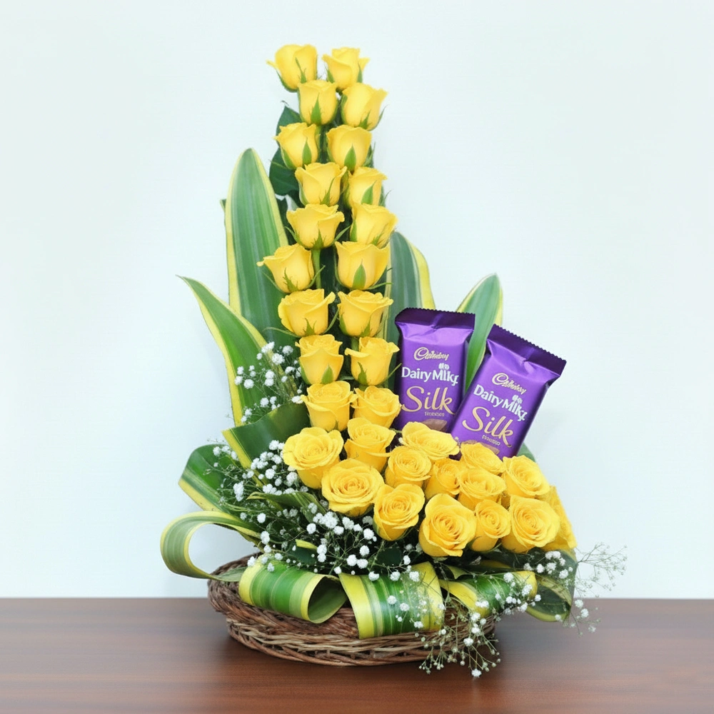 35 yellow roses in a cane basket with 2 Dairy Milk Silk chocolates, accented with gypso and yellow ribbon.