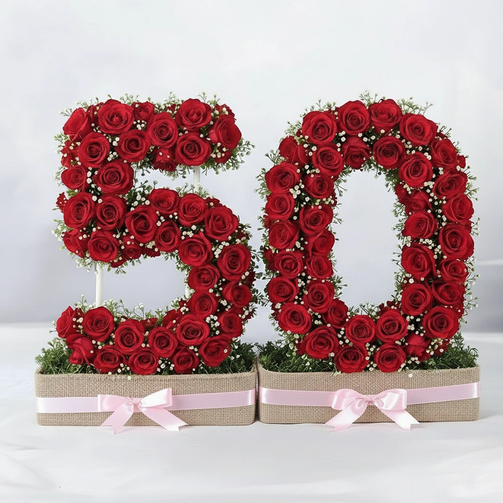 For all user 200 Rs Off on Order above ₹2500 [Code : SAVE0] Floral number “50” made with 100 red roses, mounted on foam base with gypso accents and red ribbon detailing.