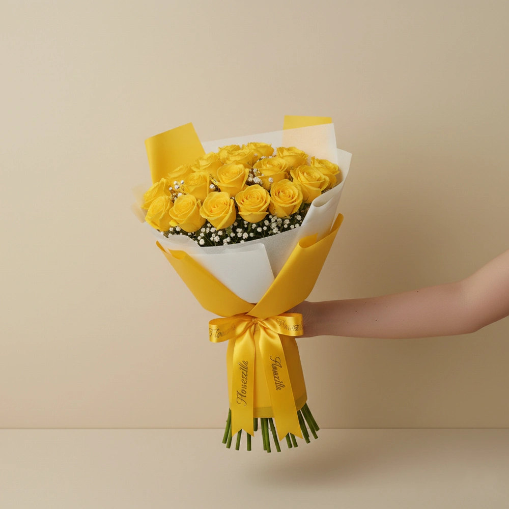 30 yellow roses in white and yellow tissue wrap tied with yellow ribbon and gypsophila