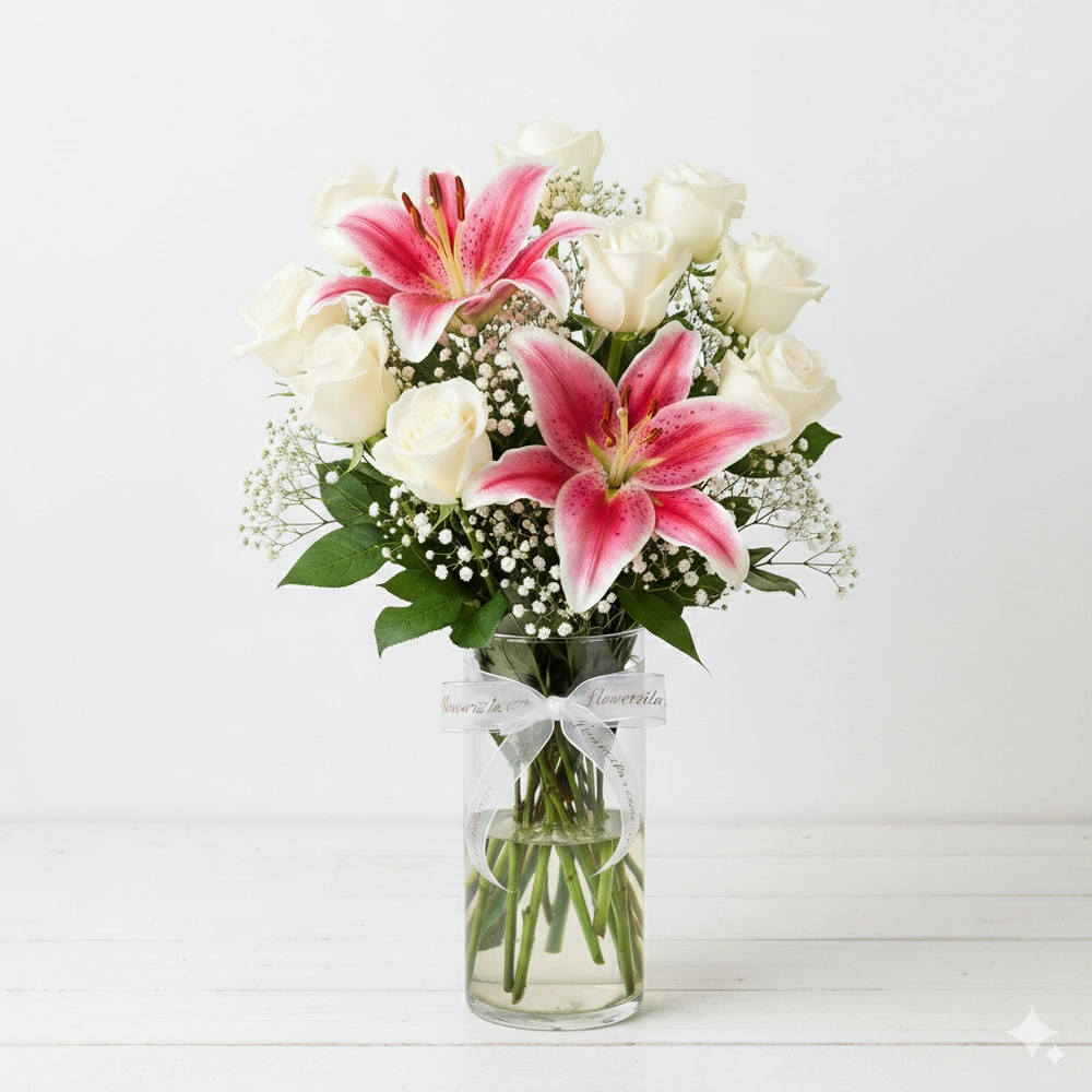 For all user 200 Rs Off on Order above ₹2500 [Code : SAVE0] 2 pink lilies, 12 white roses arrangement in paper packing with gypsophila