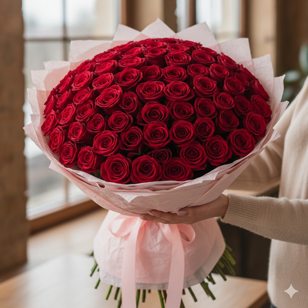 150 red roses arrangement in double paper packing with gypsophila