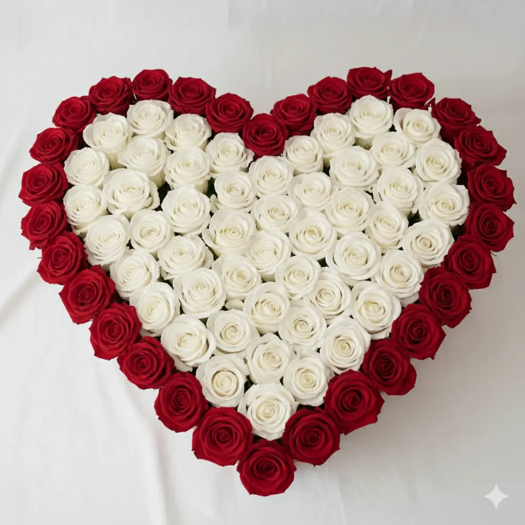 A festive heart-shaped bouquet of 75 mixed roses for joyful occasions