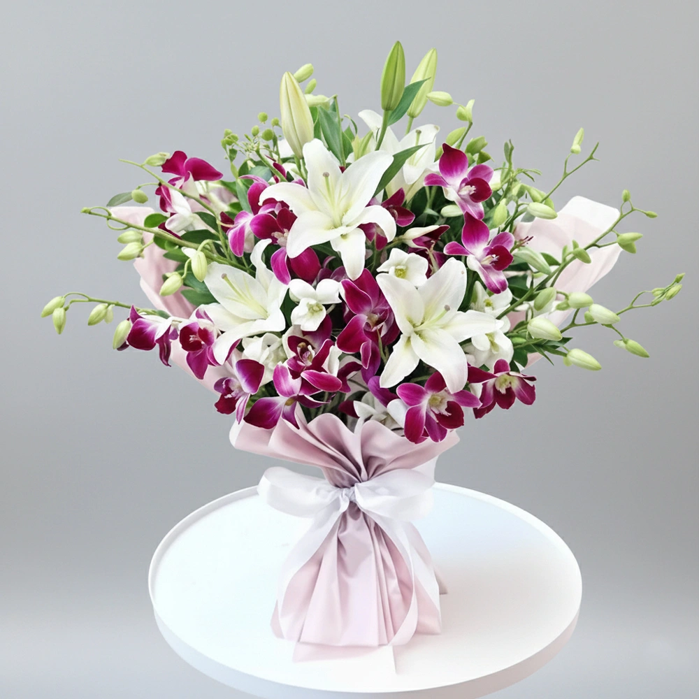 4 stem white lilies + 8 stem purple orchids in double pink paper wrap tied with lavender ribbon and gypsophila