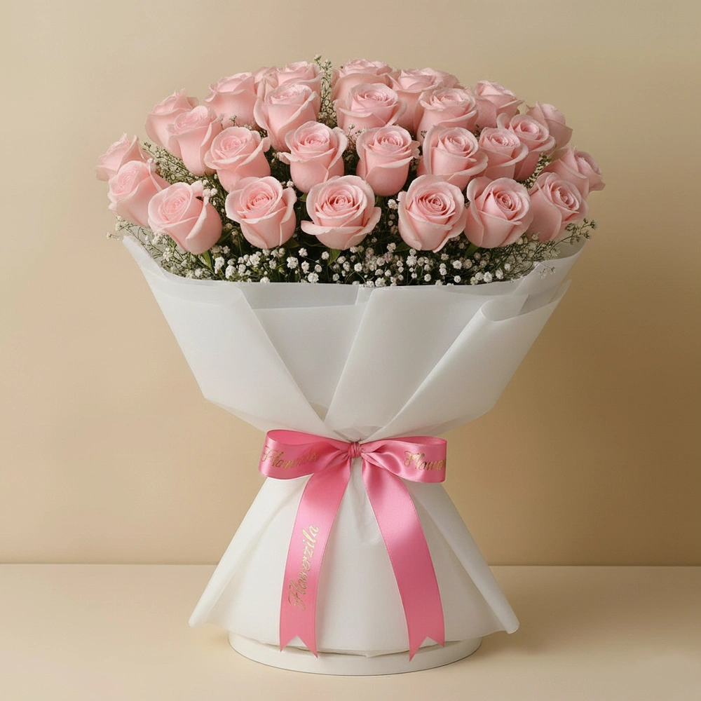40 light pink roses in double white tissue wrap tied with pastel pink ribbon and gypsophila