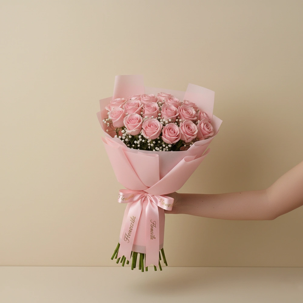 30 baby pink roses in white and light pink wrap, tied with blush pink ribbon and gypso.