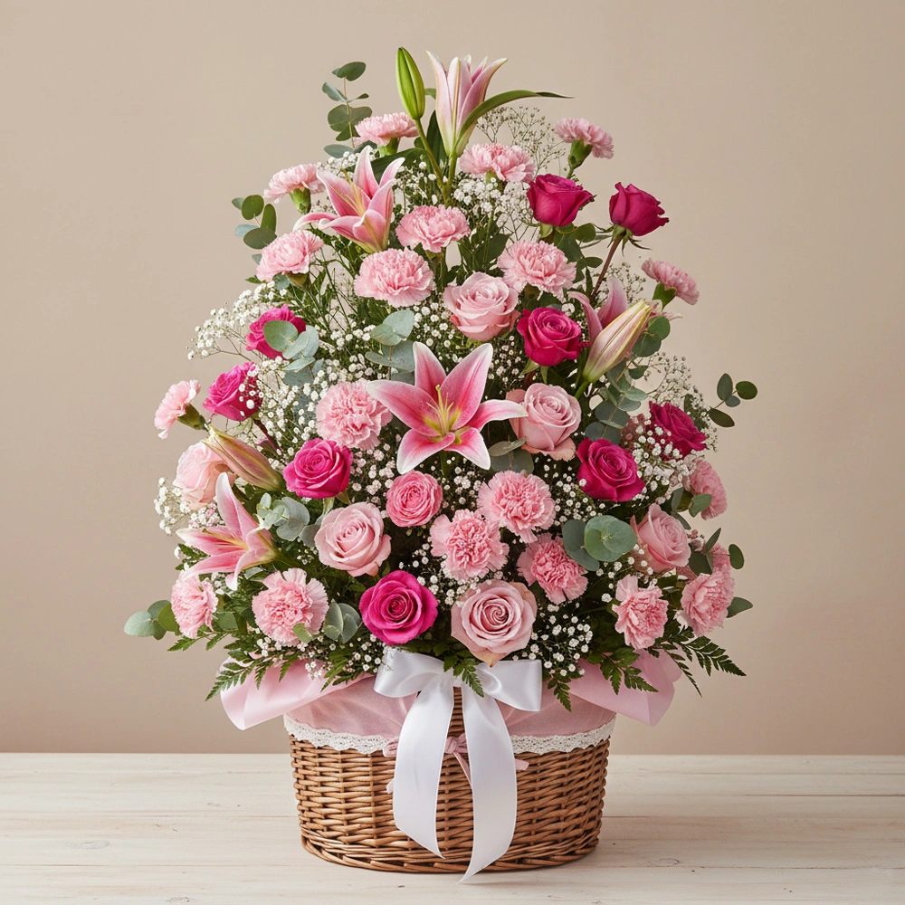 30 baby pink carnations + 30 mixed pink roses + 4 pink oriental lilies in 3 ft basket, styled with gypso and pink ribbon.