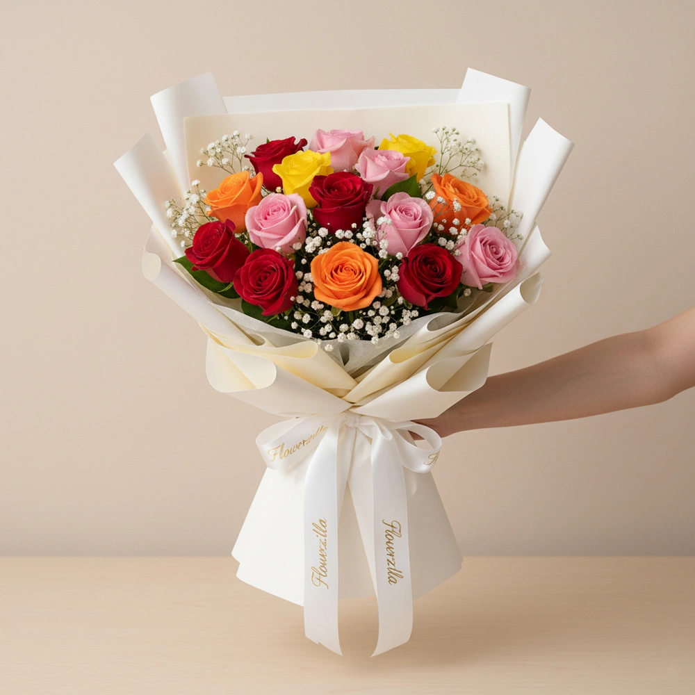 For all user 200 Rs Off on Order above ₹2500 [Code : SAVE0] 15 mixed roses arrangement in paper packing with gypsophila