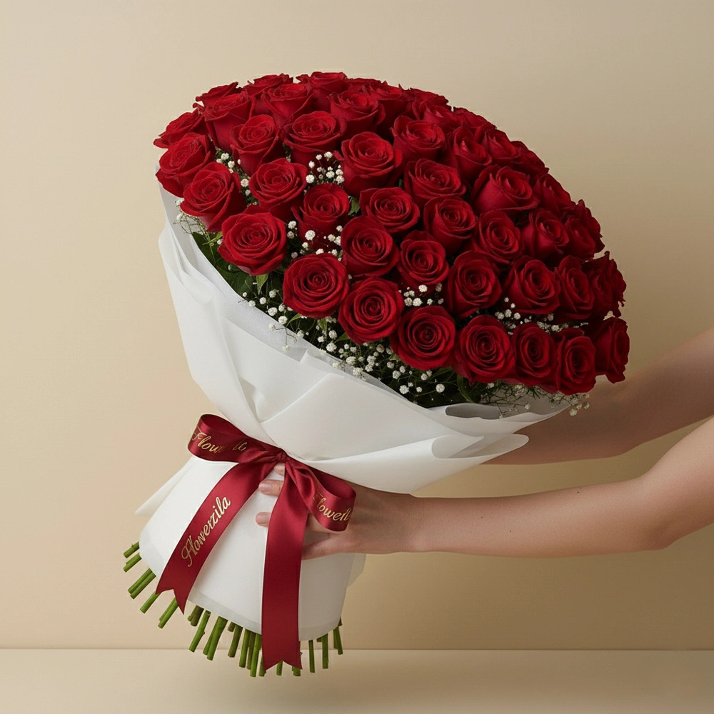 For all user 200 Rs Off on Order above ₹2500 [Code : SAVE0] 100 red roses arrangement in double paper packing with gypsophila
