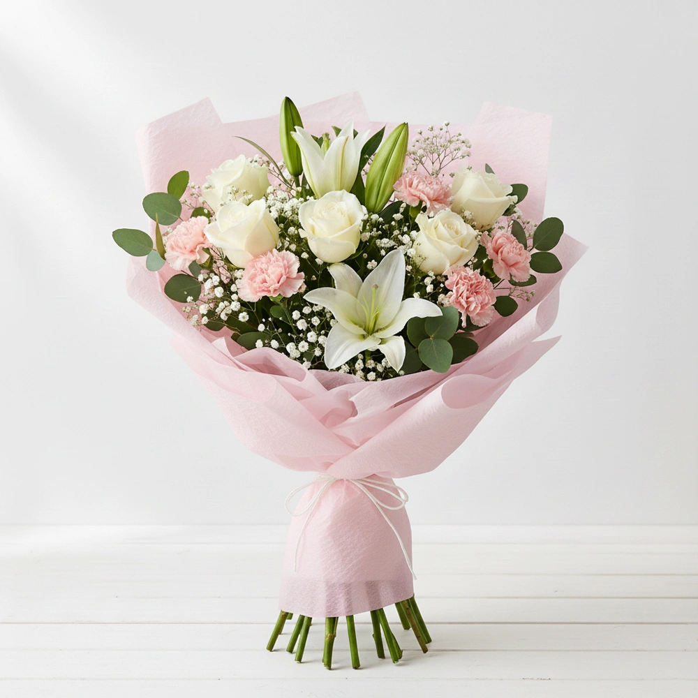 5 white roses, 2 white lilies, 5 pink carnations arrangement in paper packing with gypsophila