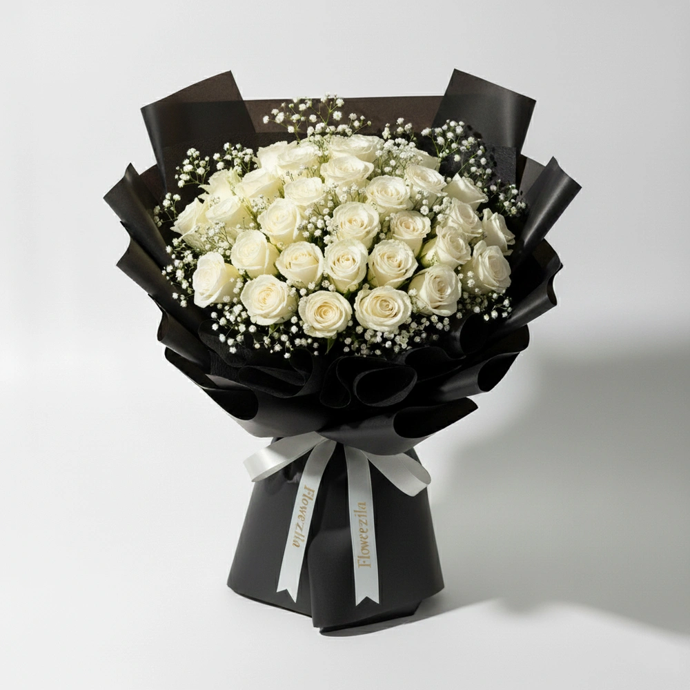 50 white roses in black tissue wrap tied with white ribbon and gypsophila