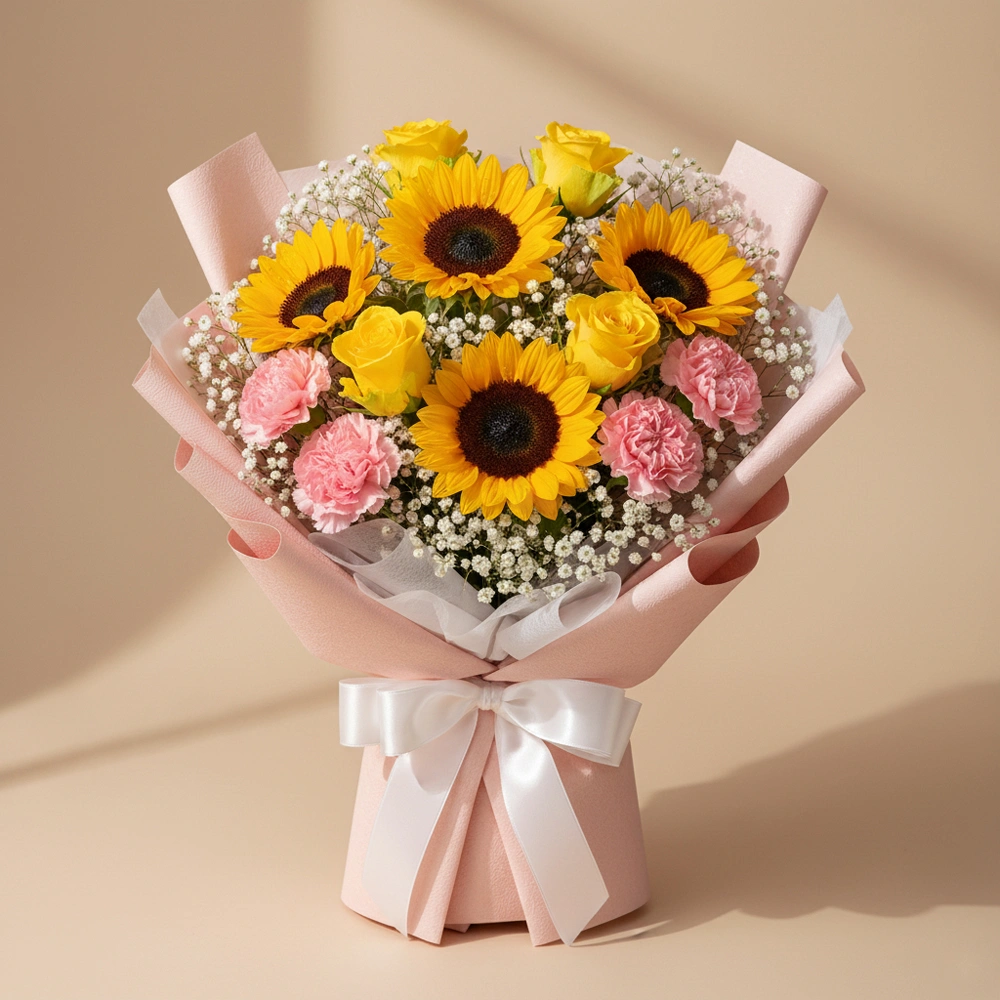 4 sunflowers, 6 yellow roses, 6 pink carnations arrangement in paper packing with gypsophila