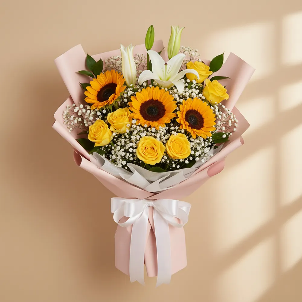 3 sunflowers, 2 stem white lilies, 5 stem yellow roses arrangement in paper packing with gypsophila