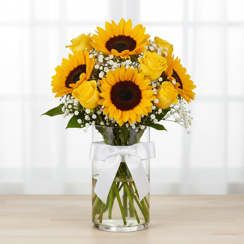 For all user 200 Rs Off on Order above ₹2500 [Code : SAVE0] 4 sunflowers, 12 yellow roses arrangement in clear vase